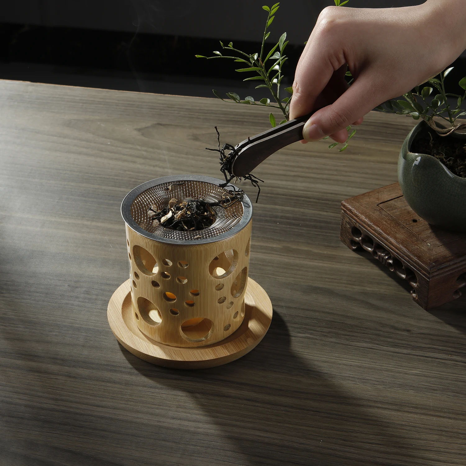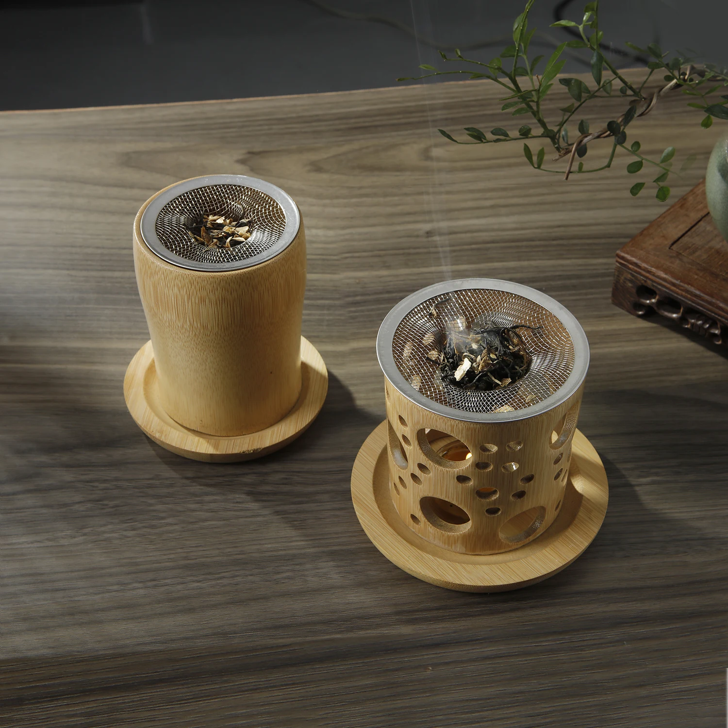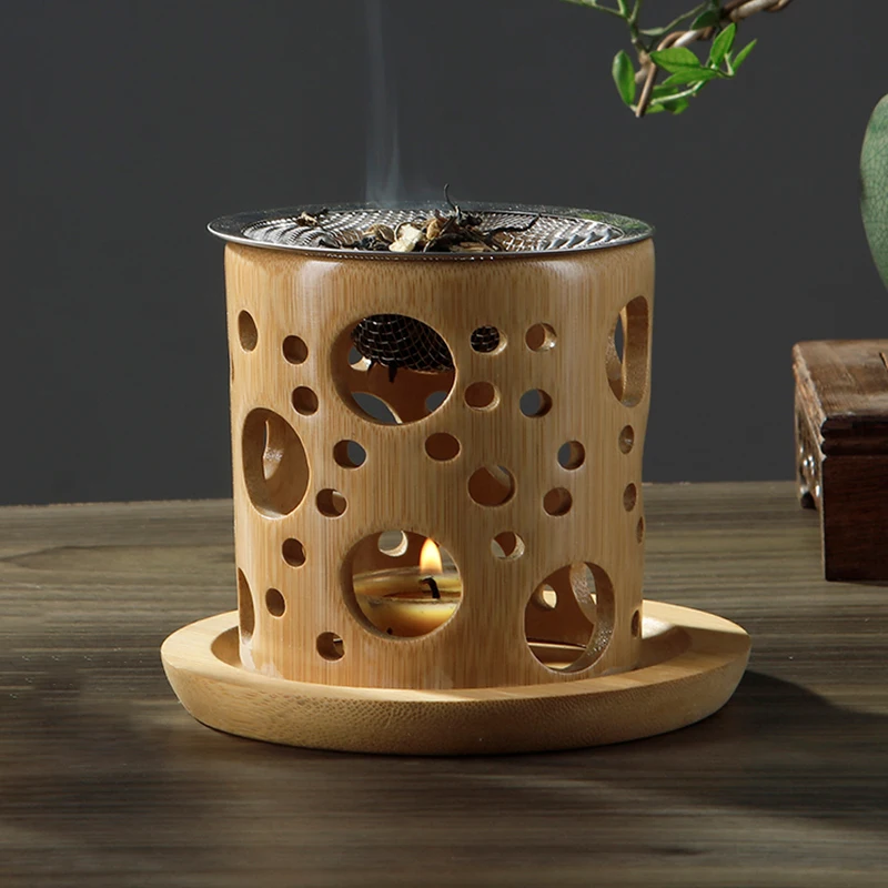 Bamboo Candle Holder Aromatherapy Heating Holder with Stainless Steel Strainer Incense Burner for Yoga SPA Aromatherapy