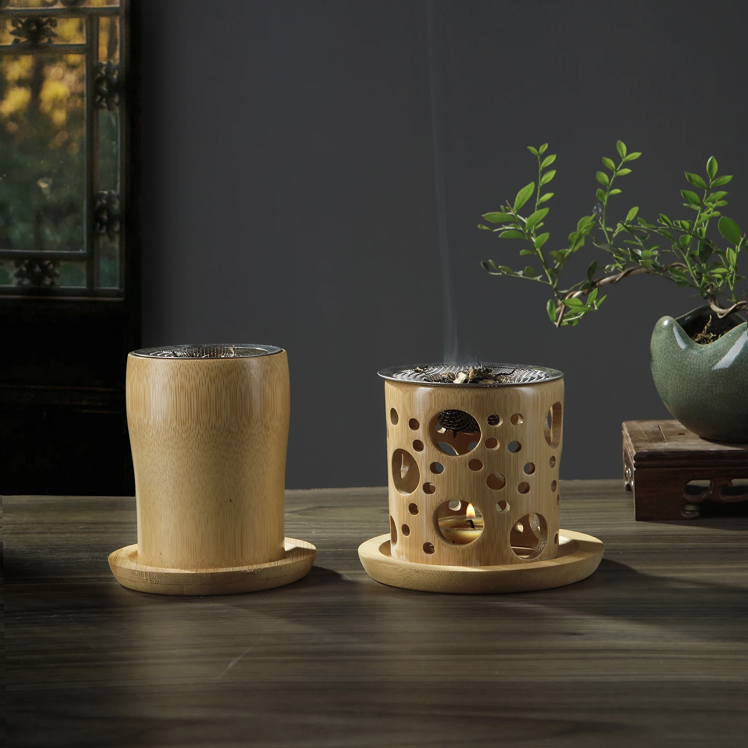 Bamboo candle holder with incense burner for aromatherapy and yoga